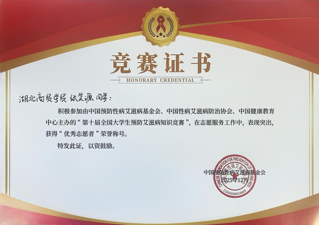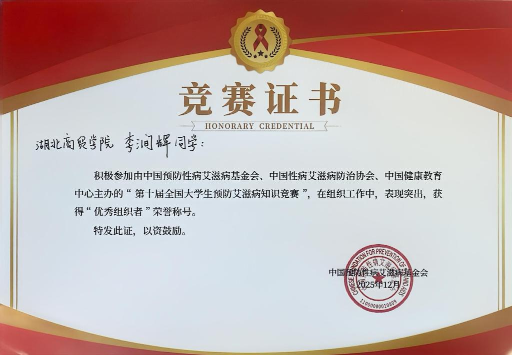 此次竞赛由中国预防性病艾滋病基金会、中国性病艾滋病防治协会、中国健康教育中心联合主办,旨在向广大青年学生普及艾滋病防治知识,提升自我保护意识与社会责任感。通过线上线下相结合的方式,积极开展防艾宣传,组织主题宣讲、推送科普内容,累计发动数百名师生参与竞赛答题与防艾知识学习,高效的组织工作让其成功摘得“优秀组织单位”称号。